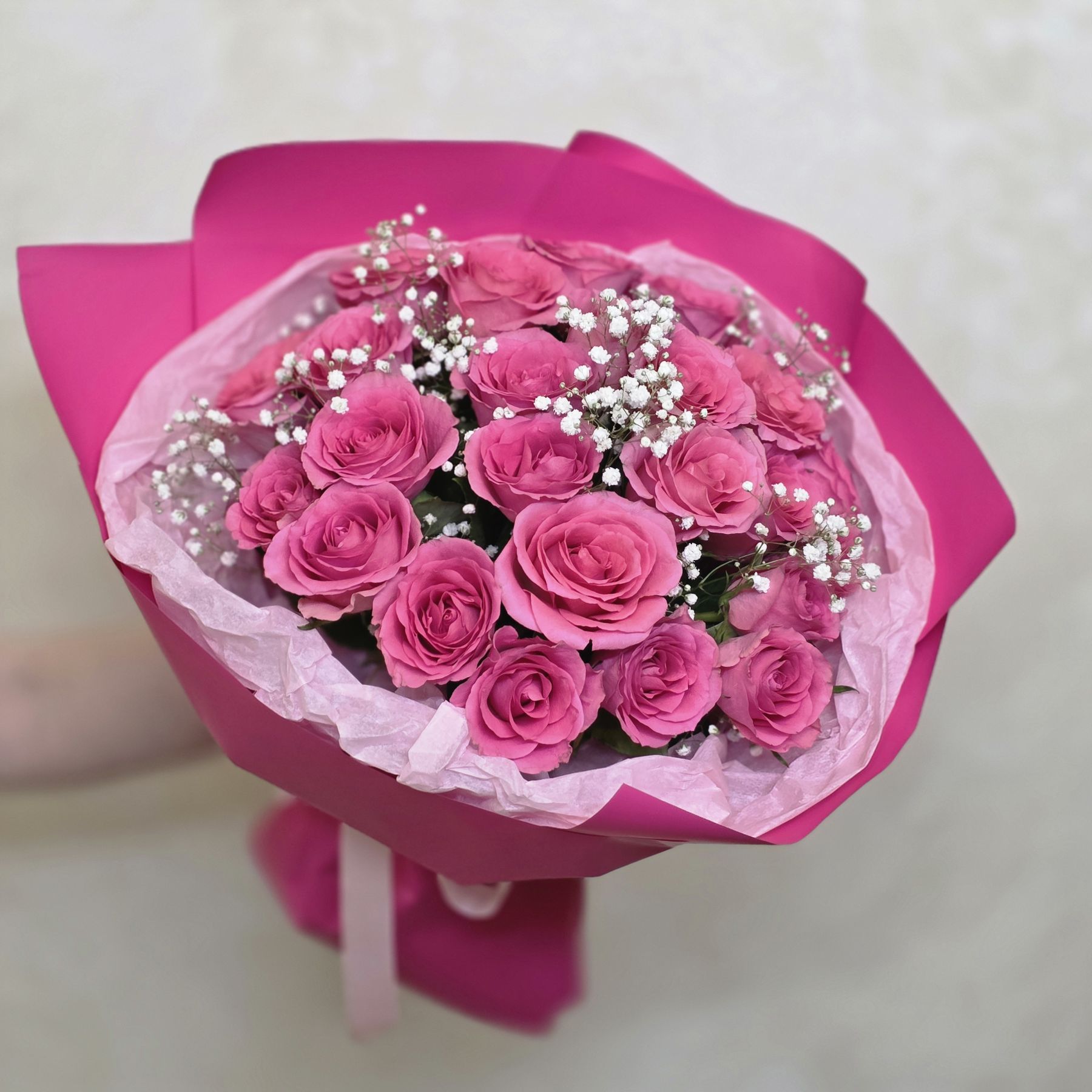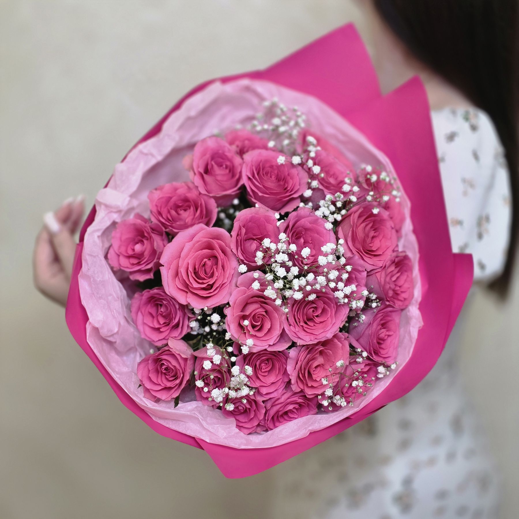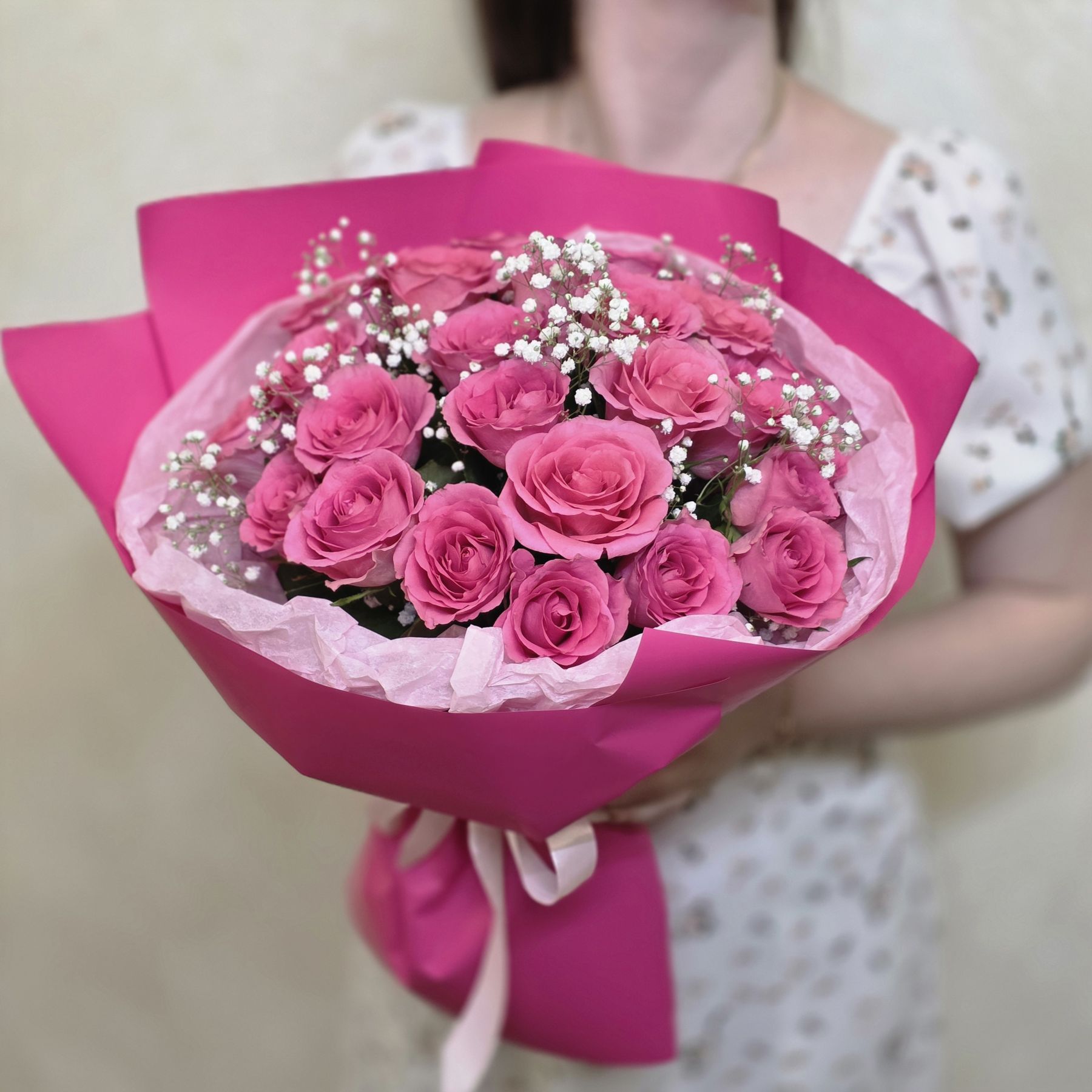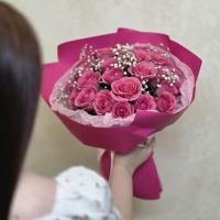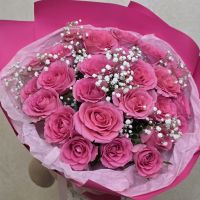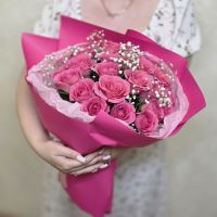 Розовые розы олицетворяют заботу и восхищение, а гипсофила добавляет легкости и изысканности, подчеркивая красоту каждого цветка. Этот букет станет идеальным подарком для любого торжества — от дня рождения до юбилея или просто как знак внимания.