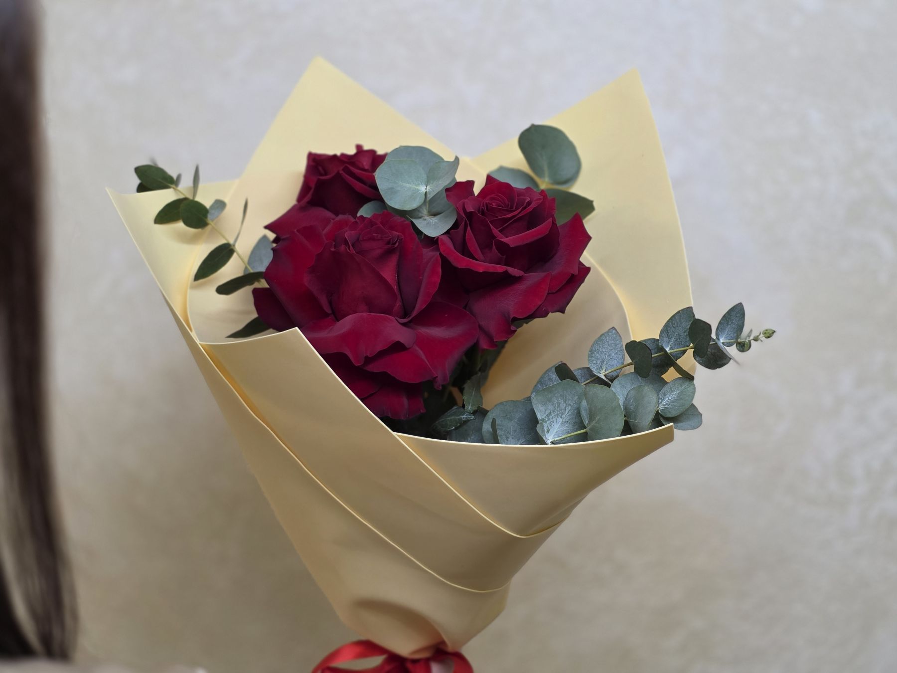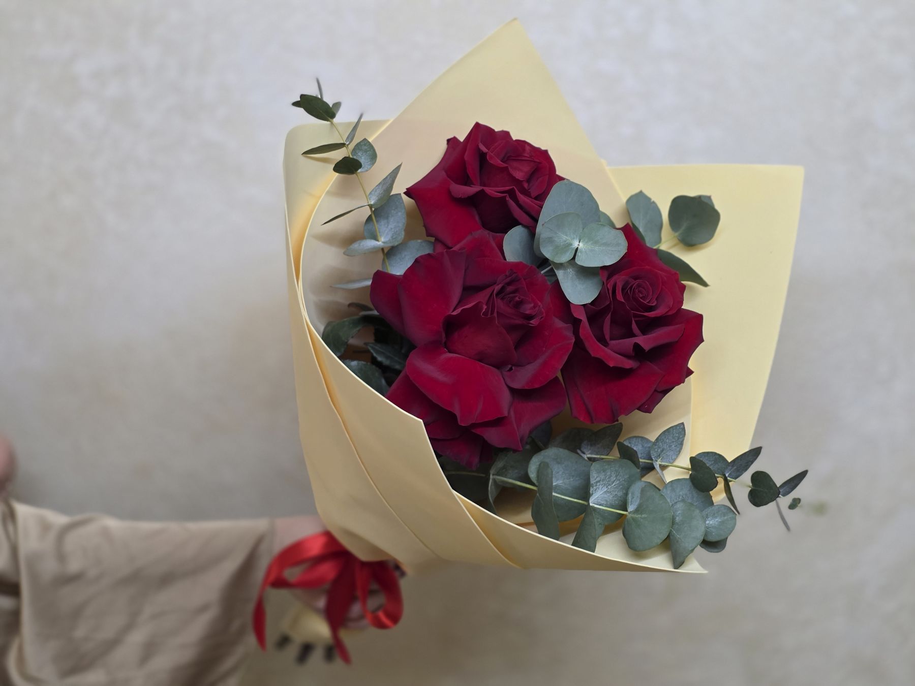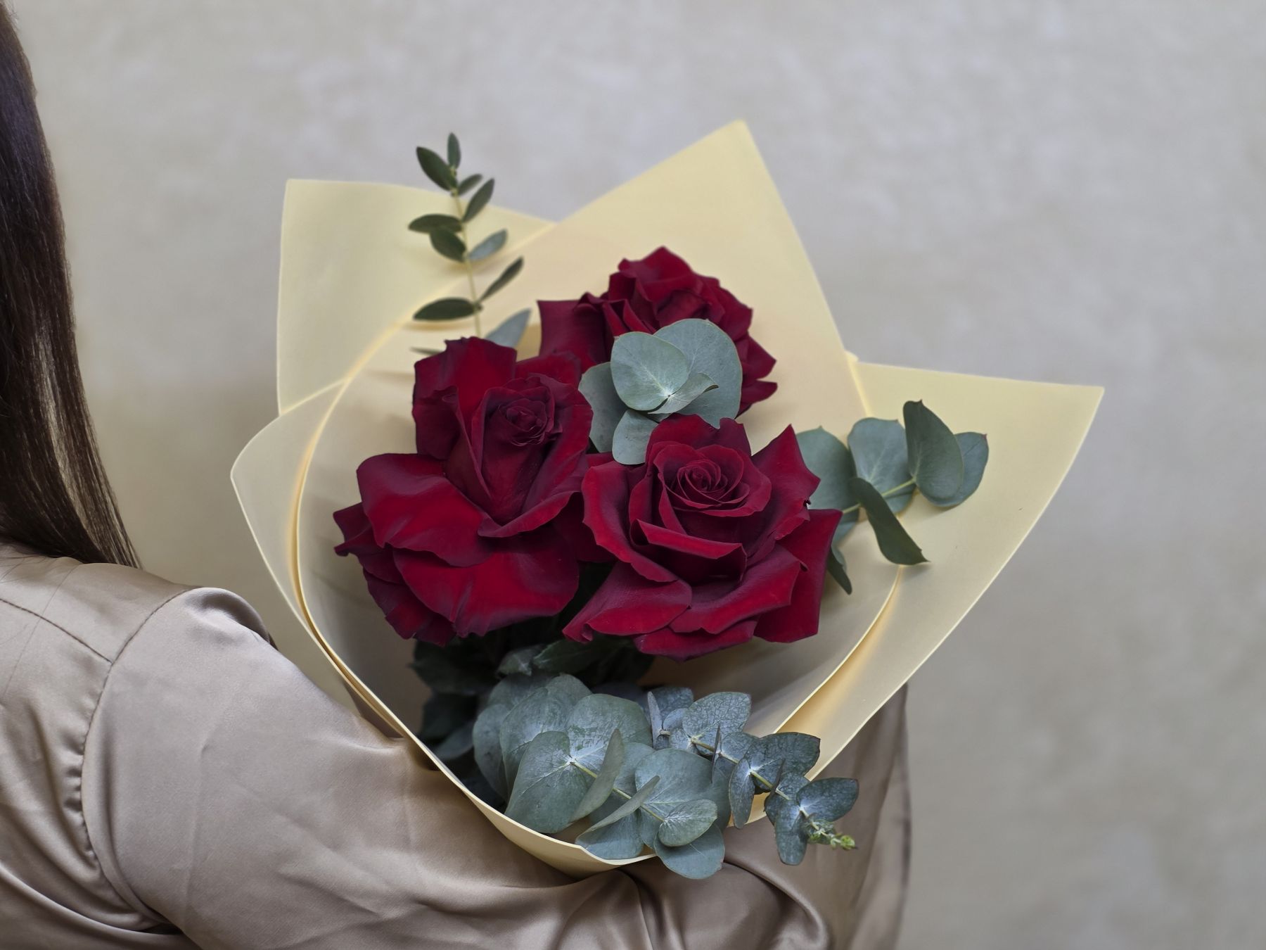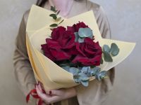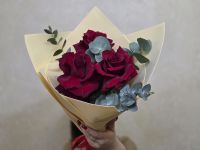 Этот букет – воплощение французского подхода к красоте, где важна каждая деталь. Три безупречных розы с классическими бокаловидными бутонами и бархатистыми лепестками создают композицию, которая говорит о многом без лишних слов.