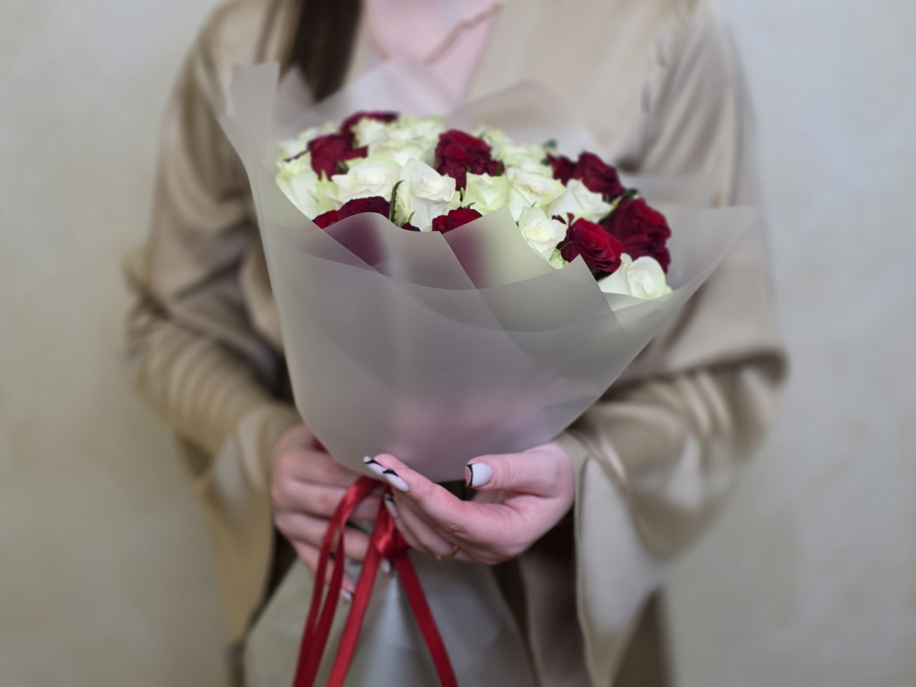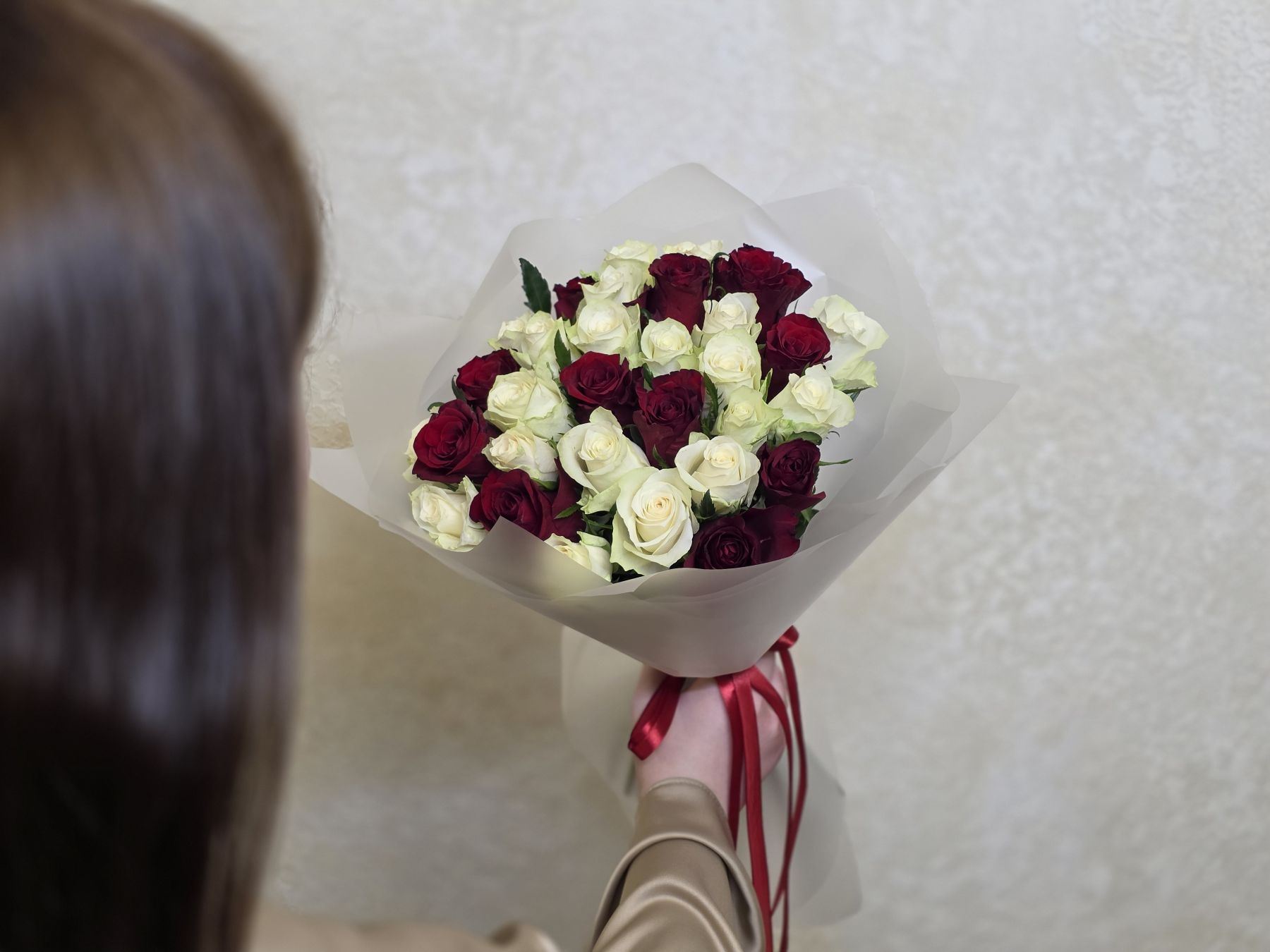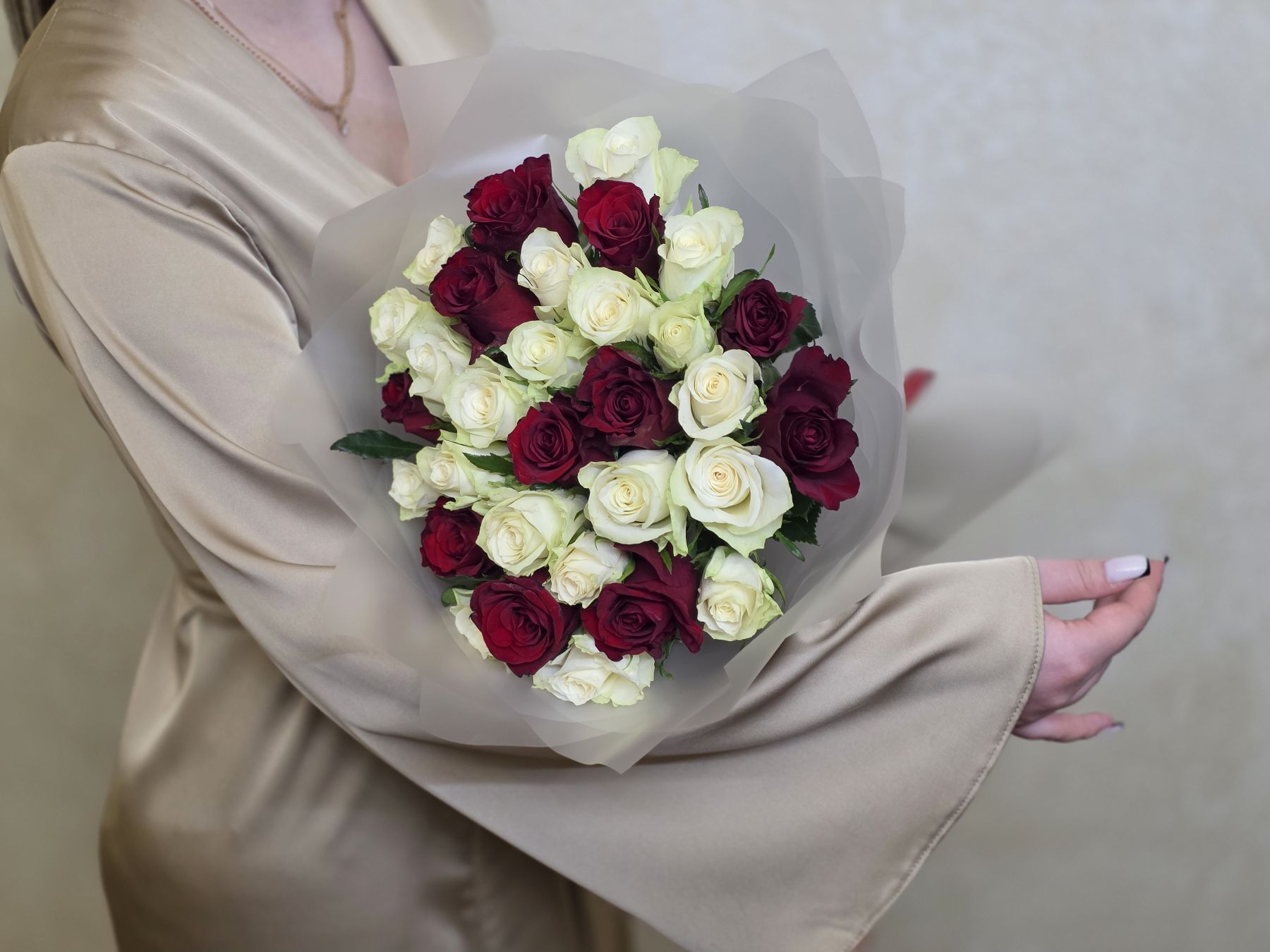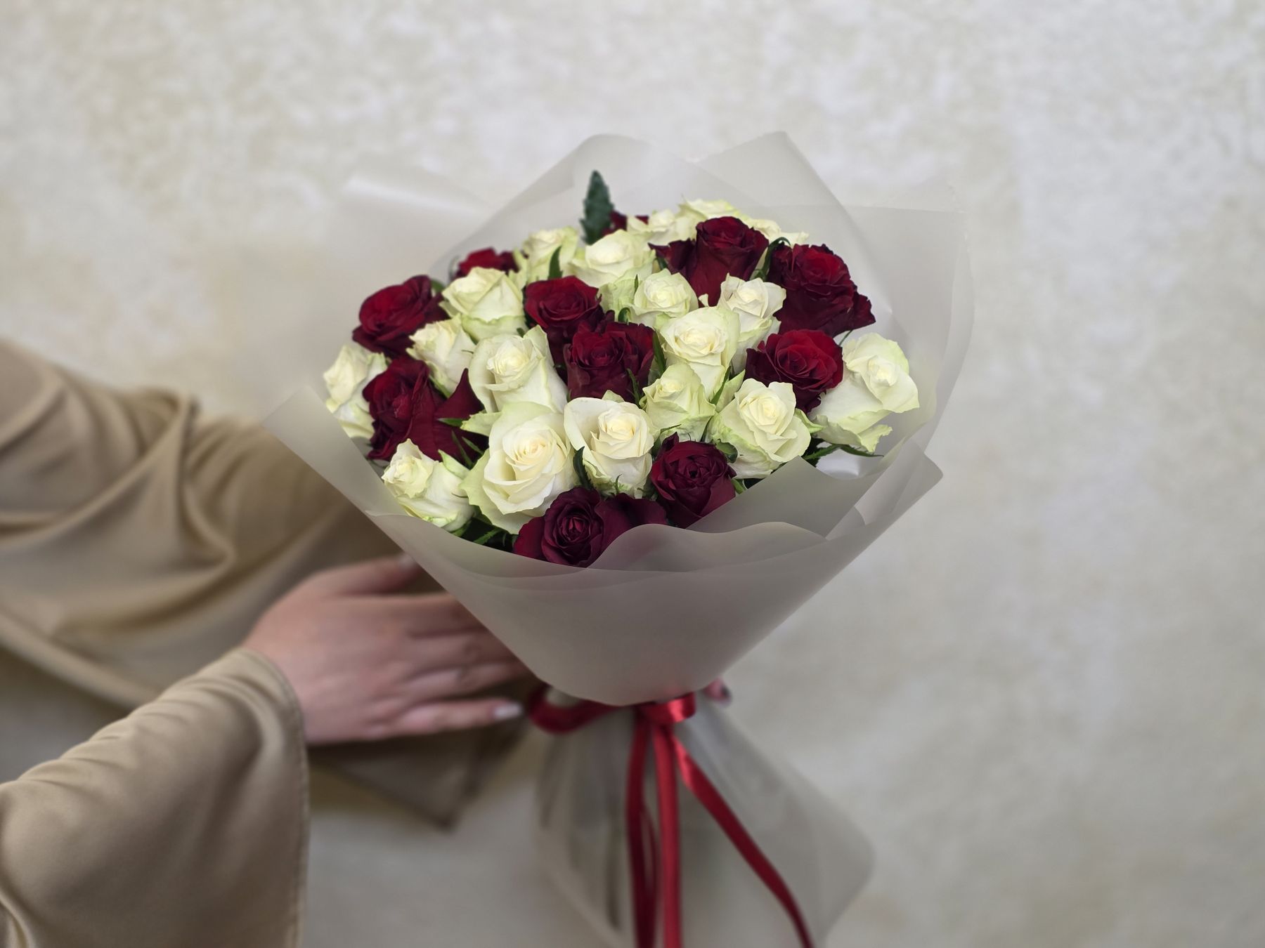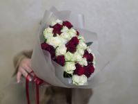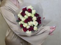 Этот букет – диалог между страстью и невинностью. Сочетание алых и белоснежных роз создает визуальную поэзию, где каждый цветок рассказывает свою часть истории.
