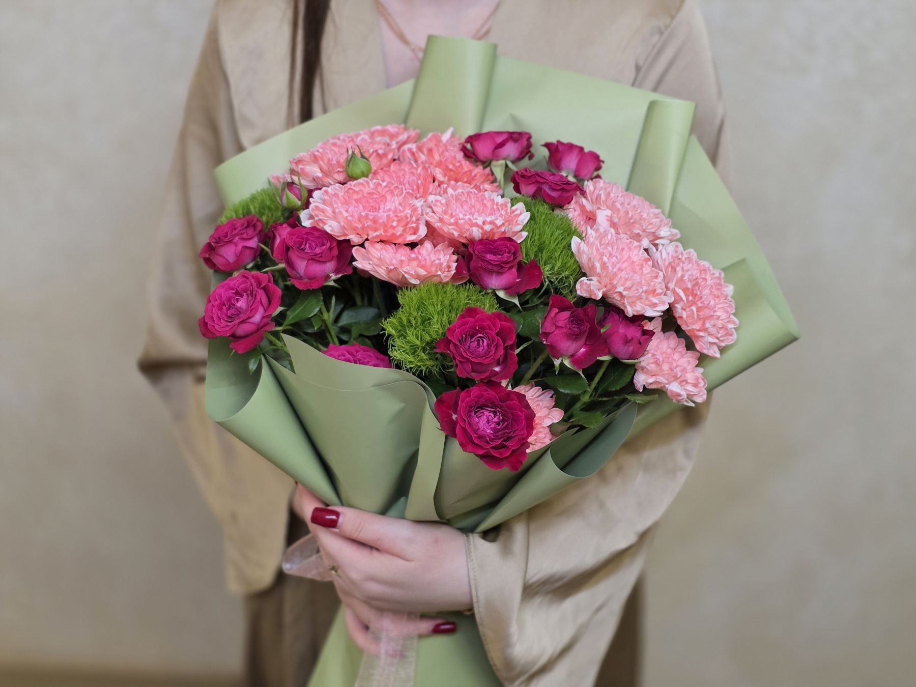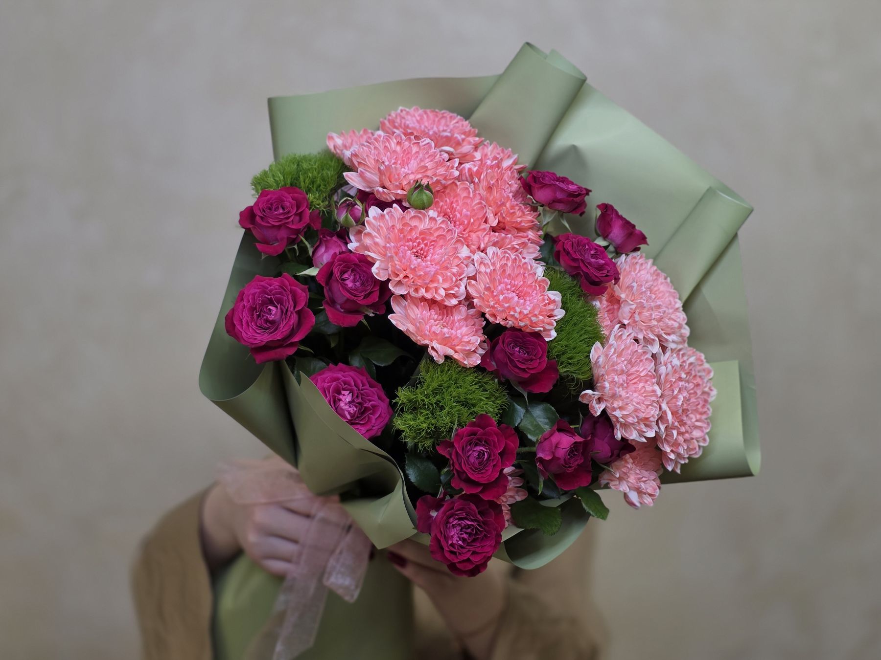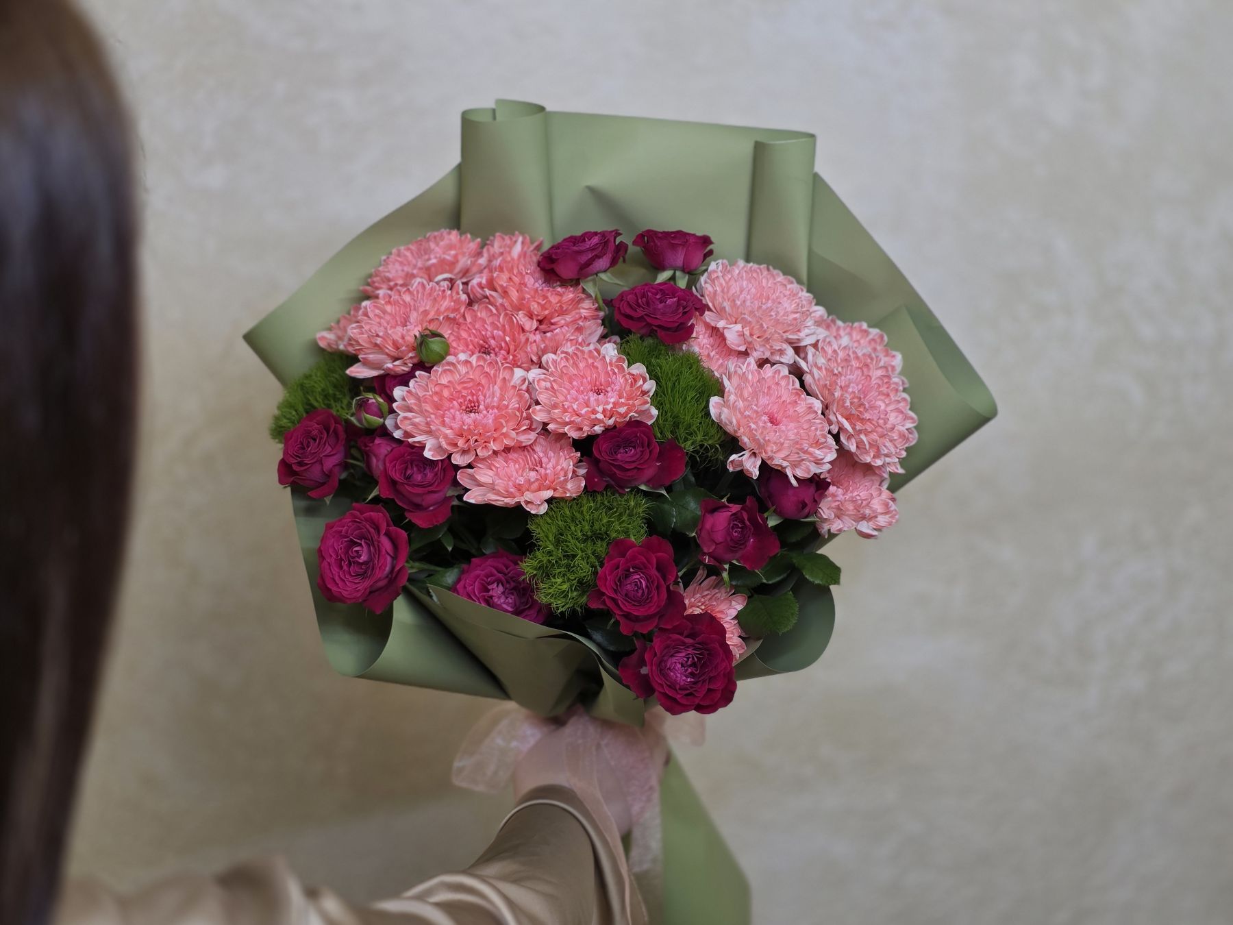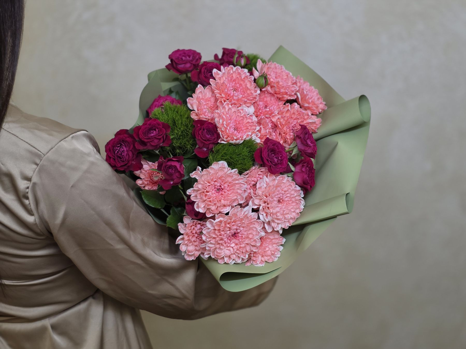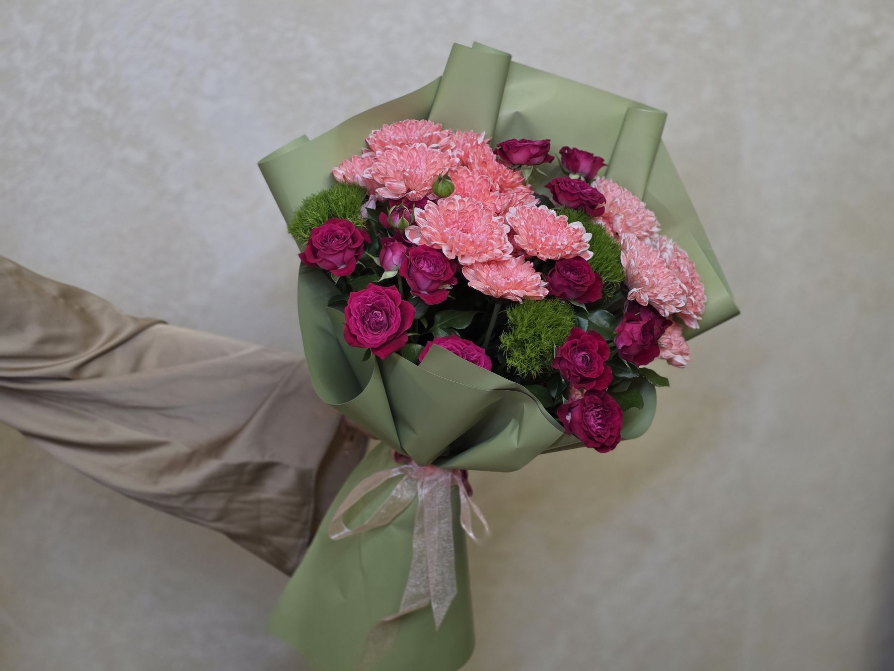 • Хризантемы обеспечивают плотность и долговечность букета