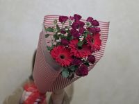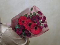 Этот букет сочетает нежную прелесть кустовых роз с солнечной яркостью гербер, создавая композицию, полную жизни и тепла. Пышные розовые бутоны и крупные соцветия гербер прекрасно дополняют друг друга, образуя гармоничный дуэт.