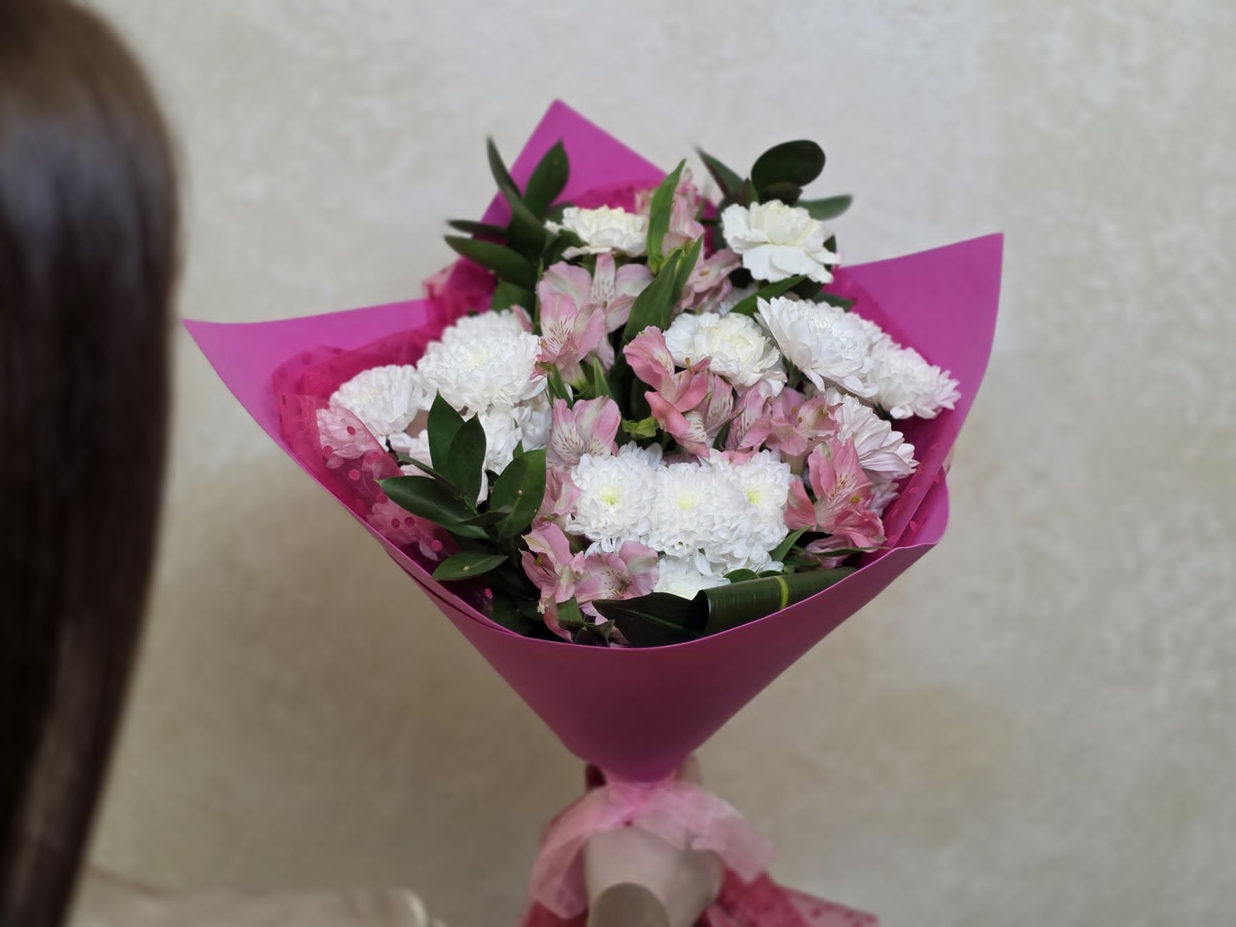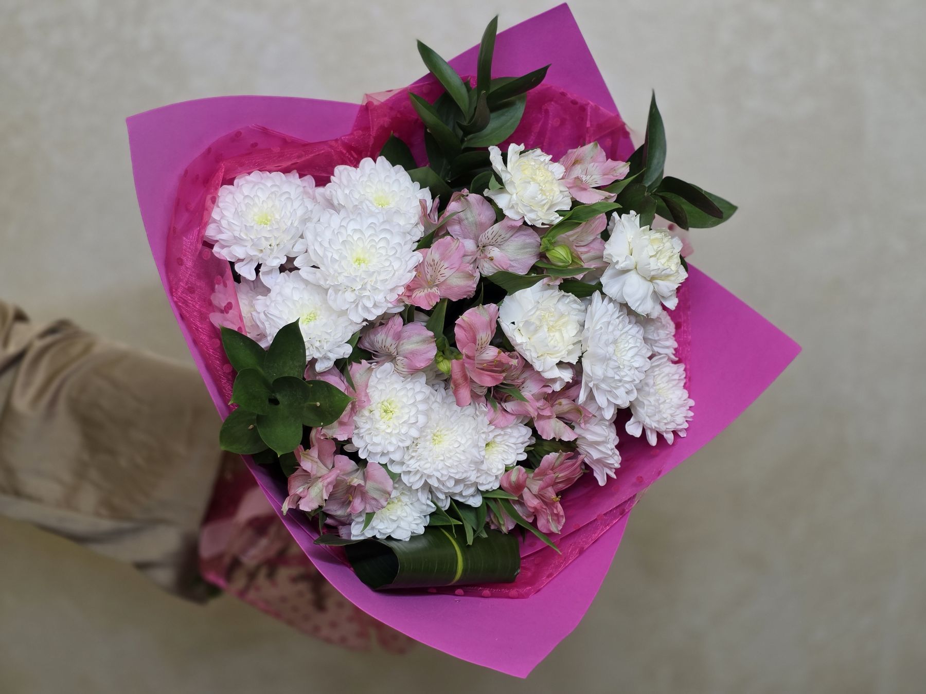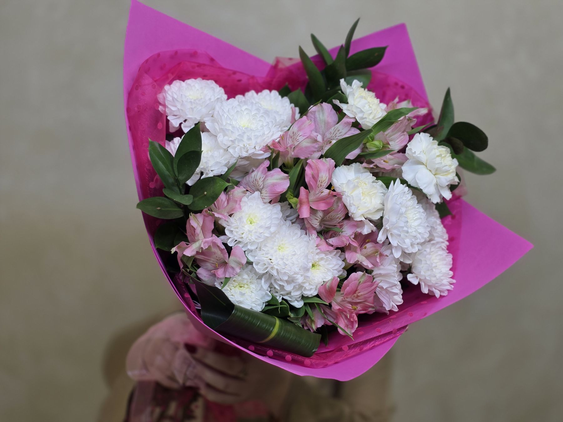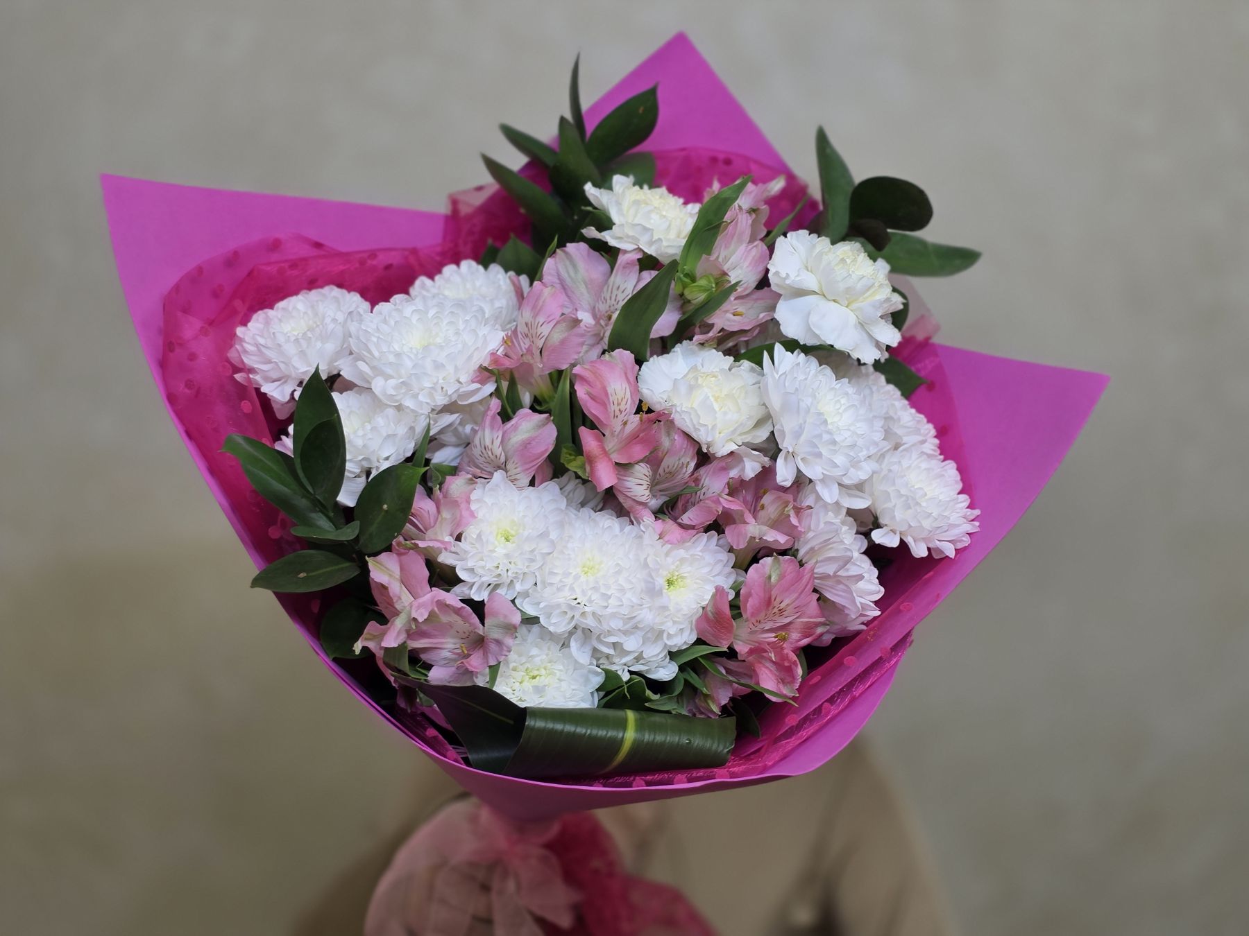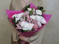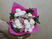 Сборный букет из кустовых хризантем, гвоздик и альстромерий